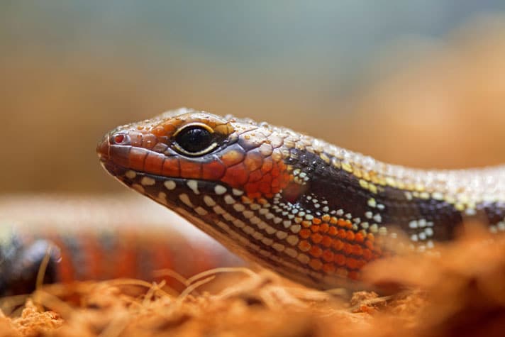 Insects, snails, spiders and worms make up most of the diet, but some fire skinks also accept pieces of fruit. Feed fire skinks during the day when they are most active. Aim a directional heat lamp at one corner of the cage so there’s a hot spot for the fire skink to sunbathe to reach their preferred temperatures for activity and digestion.