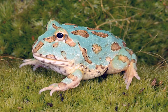 The horned frogs are not an overly active species, and captives do not require particularly large terraria. An adult female (or pair) of horned frogs will thrive in a 15- to 20-gallon (horizontally oriented) aquarium. Captive specimens may be maintained either terrestrially, or in a plain terraria containing only a half inch of water. Horned frogs that are provided sufficient soil will quickly burrow and remain buried for more than 95 percent of the time, leading many owners to keep them in a plain terraria. This type of set-up requires frequent, if not daily, cleaning as bacteria proliferate in this type of terrarium.
